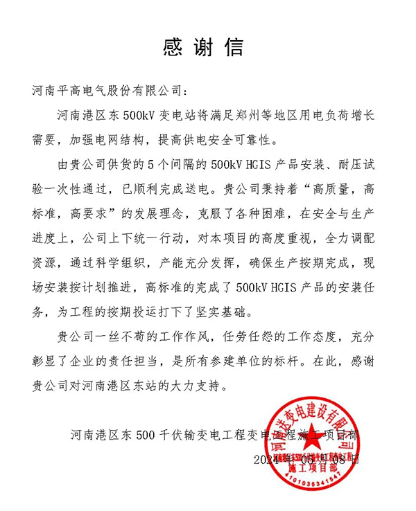平高电气超特高压事业部收到了河南港区东电站施工项目部送来的感谢信和锦旗 91高清视频播放,客户对其高质量,高标准,高要求完成电站产品安装任务表示感谢。
